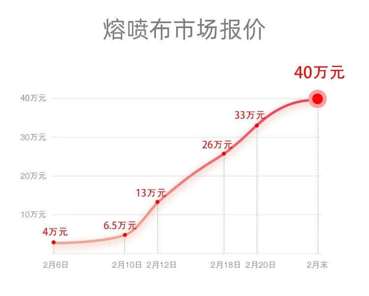 這條被業內人士稱為“達到極致市場行情”、不斷上揚的價格曲線,代表了國內一噸熔噴布實時的市場報價,無疑,它正緊緊扼住了口罩擴大產能的咽喉。